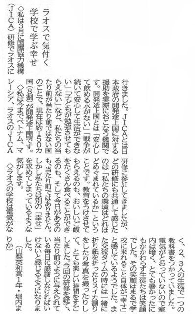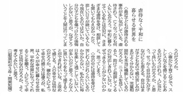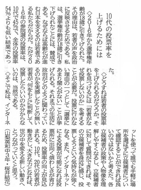山梨日日新聞『10代の意見』に掲載されました。(10月5…