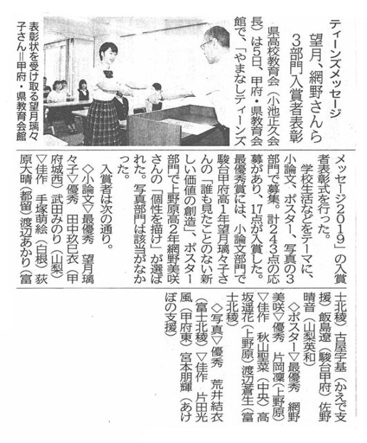 『やまなしティーンズメッセージ2019』入賞しました。
