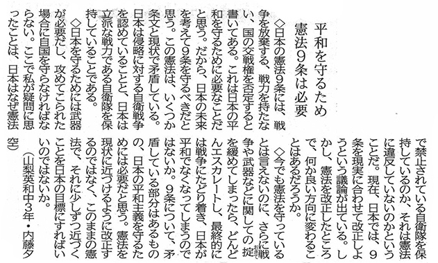 山梨日日新聞『10代の意見』に掲載されました。(2月26…