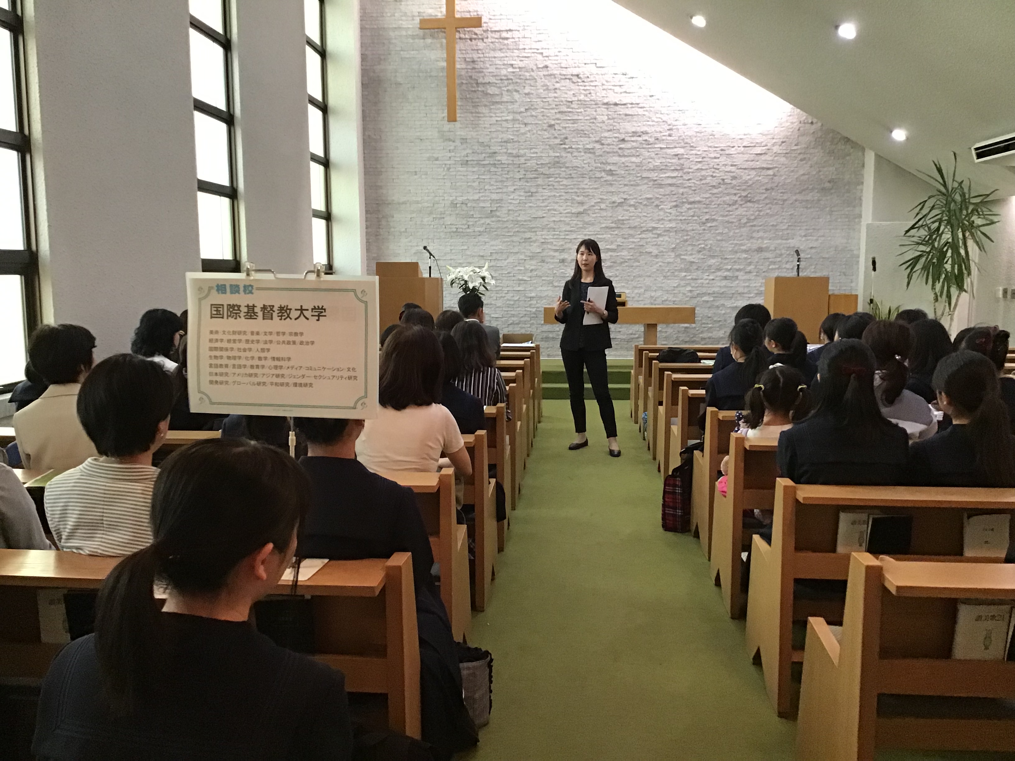 恒例となっています5月の進学ガイダンス(学校説明会)に先立ち、4月26日(金)にキリスト教主義の大学にお集まりいただき、本校最寄りの愛宕町教会にて学校説明会を実施いたしました。年々増えるキリスト教主義大学への進学希望者に、ゆっくりと相談できる場を提供したいと考え、下記7校のご協力を得て、開催に漕ぎ着けた次第です。今年度初めての試みではありましたが、多くの生徒、保護者の皆様に足を運んでいただくことができました。長蛇の列に個別相談では対応しきれない大学もあり、熱気の内に予定時間を超えての終了となりました。ご参加いただきました大学、短期大学の皆様に感謝申し上げます。