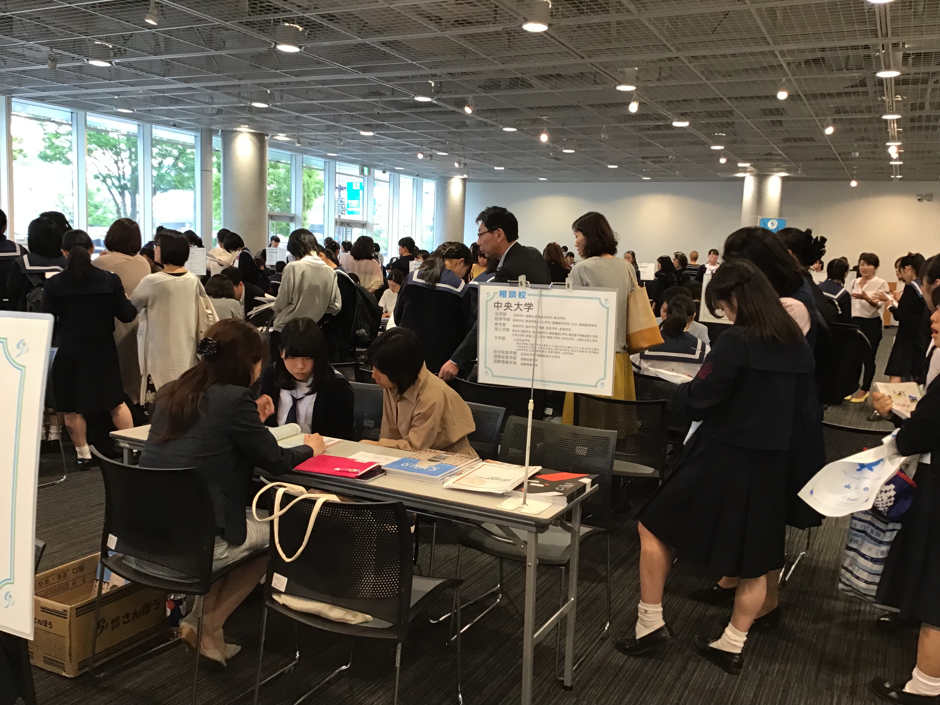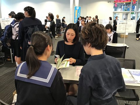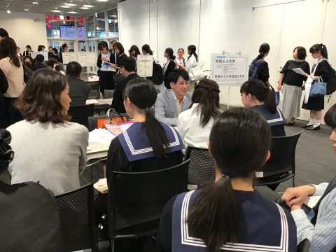 毎年恒例となった本校主催の進学相談会を、今年は5月11日(金)夕方より、山梨県立図書館にて行いました。今年も38校もの大学、短期大学にご参加いただくことができました。卒業生が多く進学している英和生に人気の大学、短期大学の入試担当者の方々とじっくり相談できる場として、年々、親子での参加率が高くなっています。特に高3生には、受験に向けてより具体的な相談と明確な目標設定ができる場として活用されています。多くの入試担当者の方々からは、「英和生の意識の高さが感じられた」、「親子で相談にきて貰えたので、大学について認識を深めてもらえた」等の感想をいただきました。今年も熱気の内に大幅に予定時間を超えての終了となりました。ご参加いただきました大学、短期大学の皆様に感謝申し上げます。