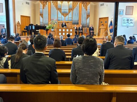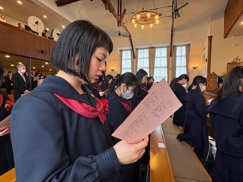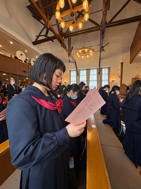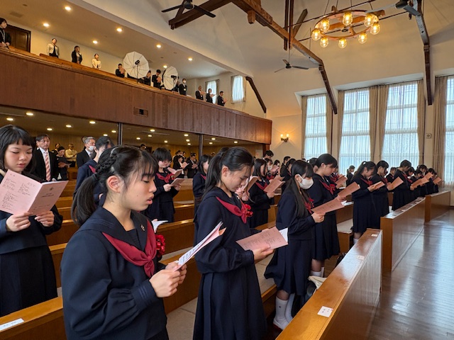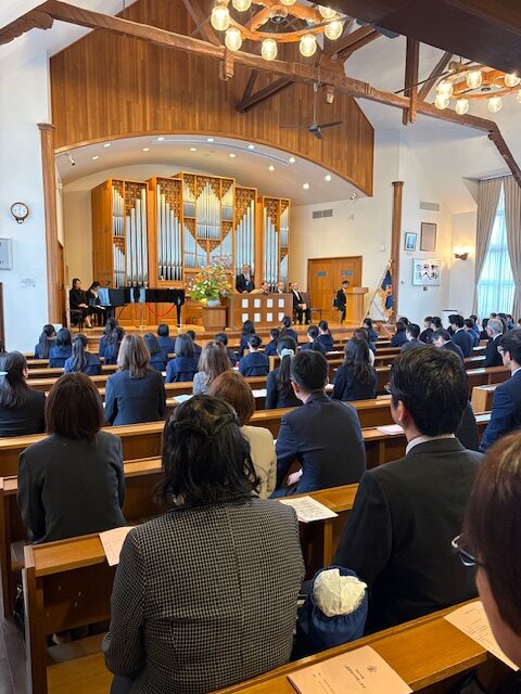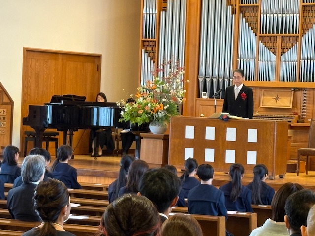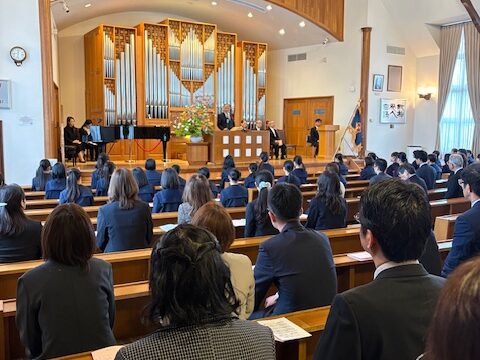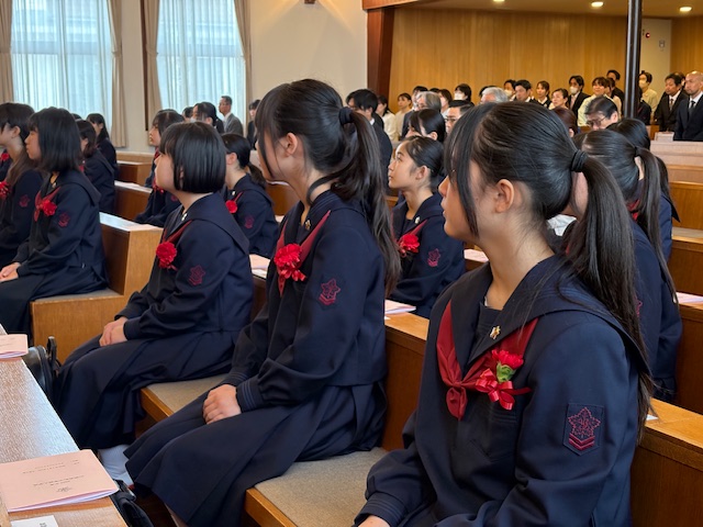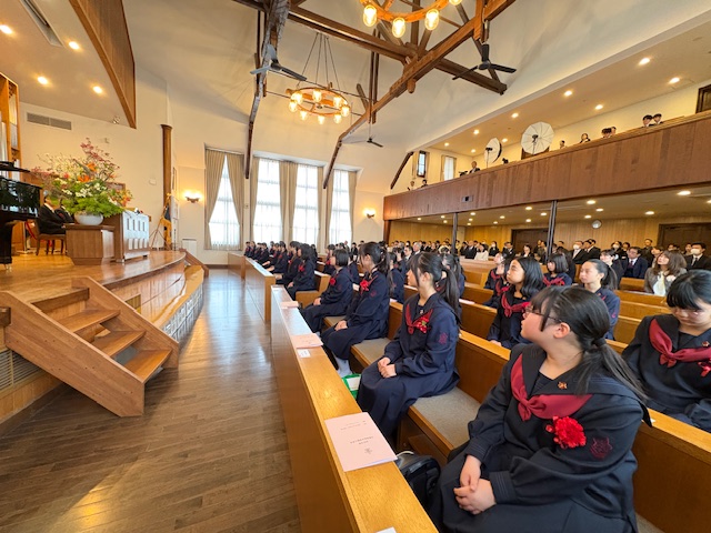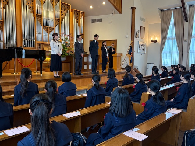 式後には、緊張がほぐれた晴れやかな表情が新入生の顔に広がっており、新たな歩みを始める生徒たちに、聖書の言葉が静かに、そして力強く届けられた入学式となりました。