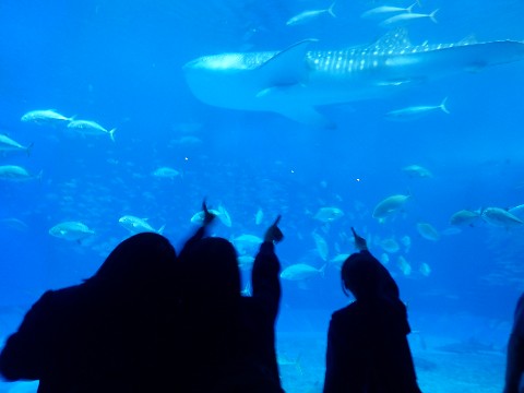 全長8.7mのジンベエザメが優雅に泳ぐ姿に、歓声をあげていました。