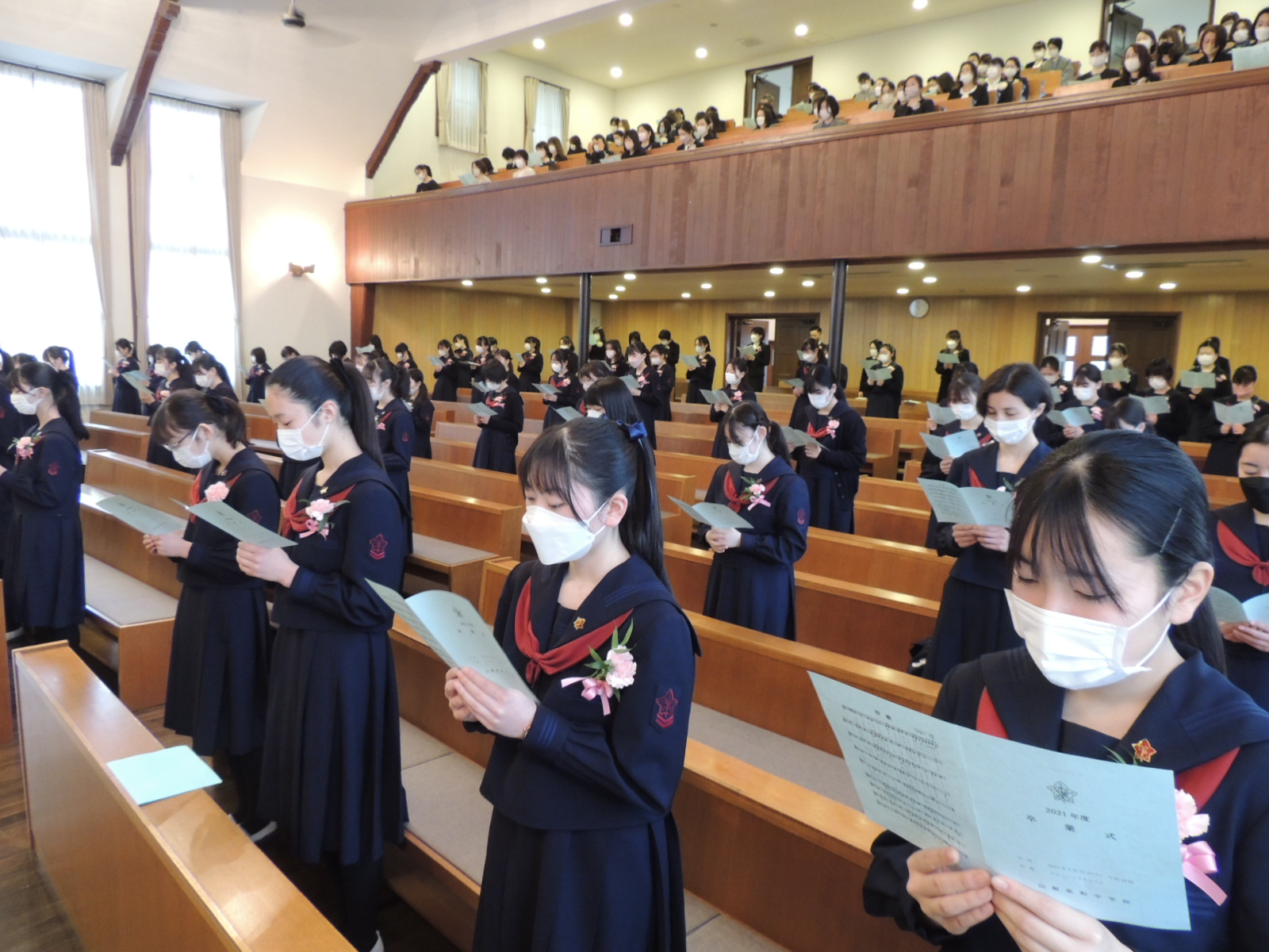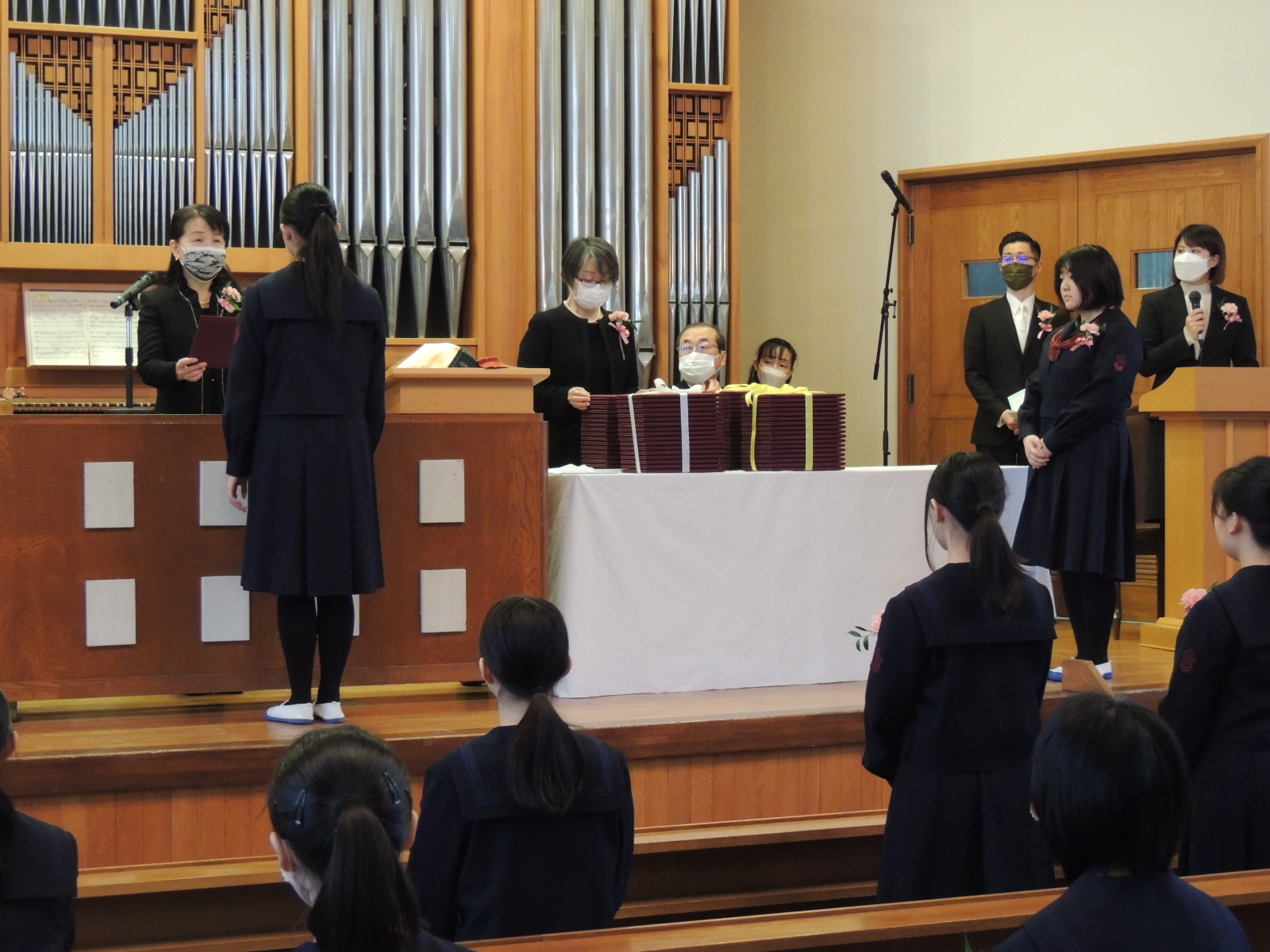 皆さんは、本日9年間の義務教育に終止符を打ち、次のステージへと歩みを進めます。今後は自らの意志によって学んでいくことになります。その歩みの中で、この祈りに支えられ感謝して前進する勇気を与えられますように。