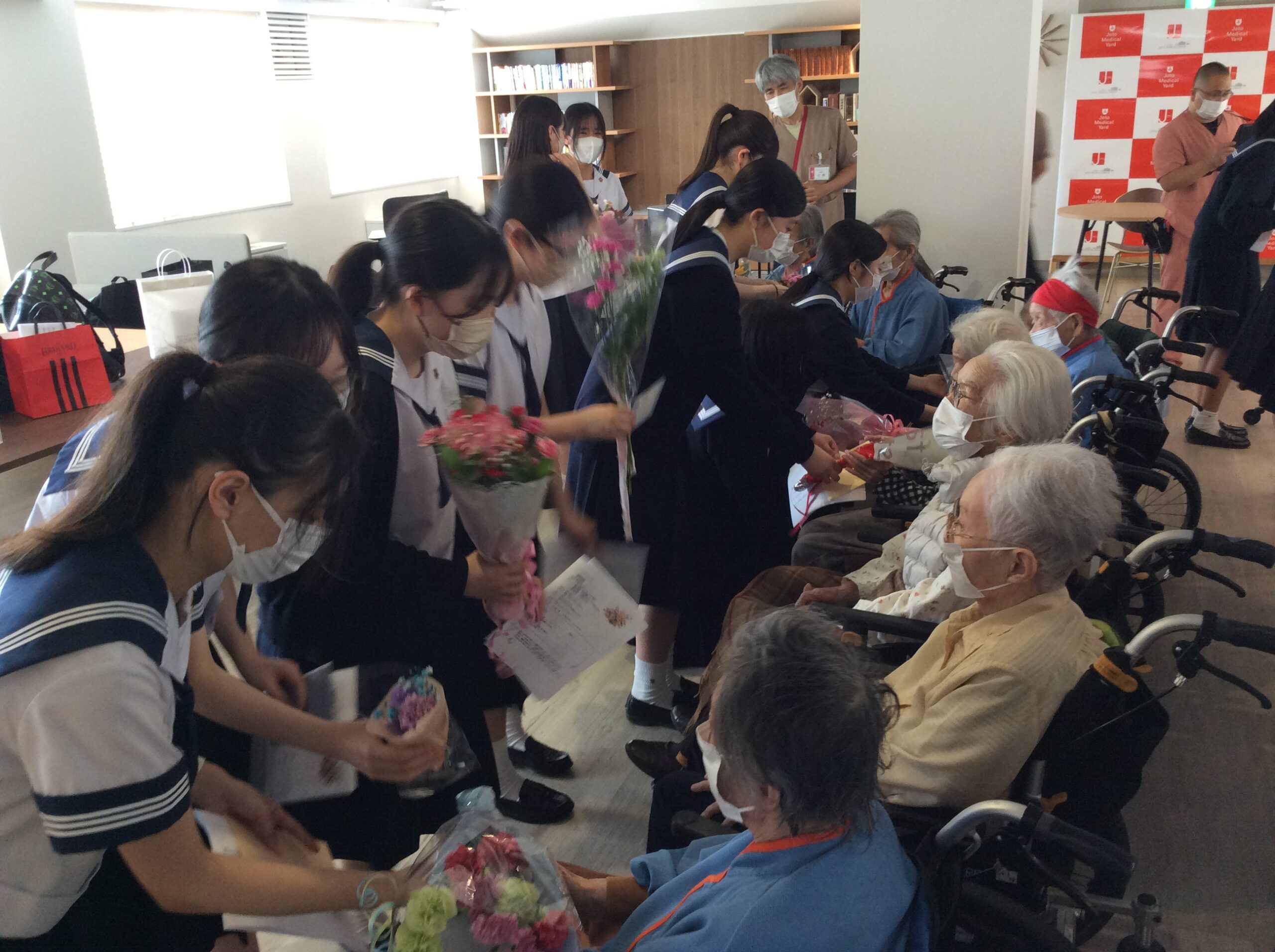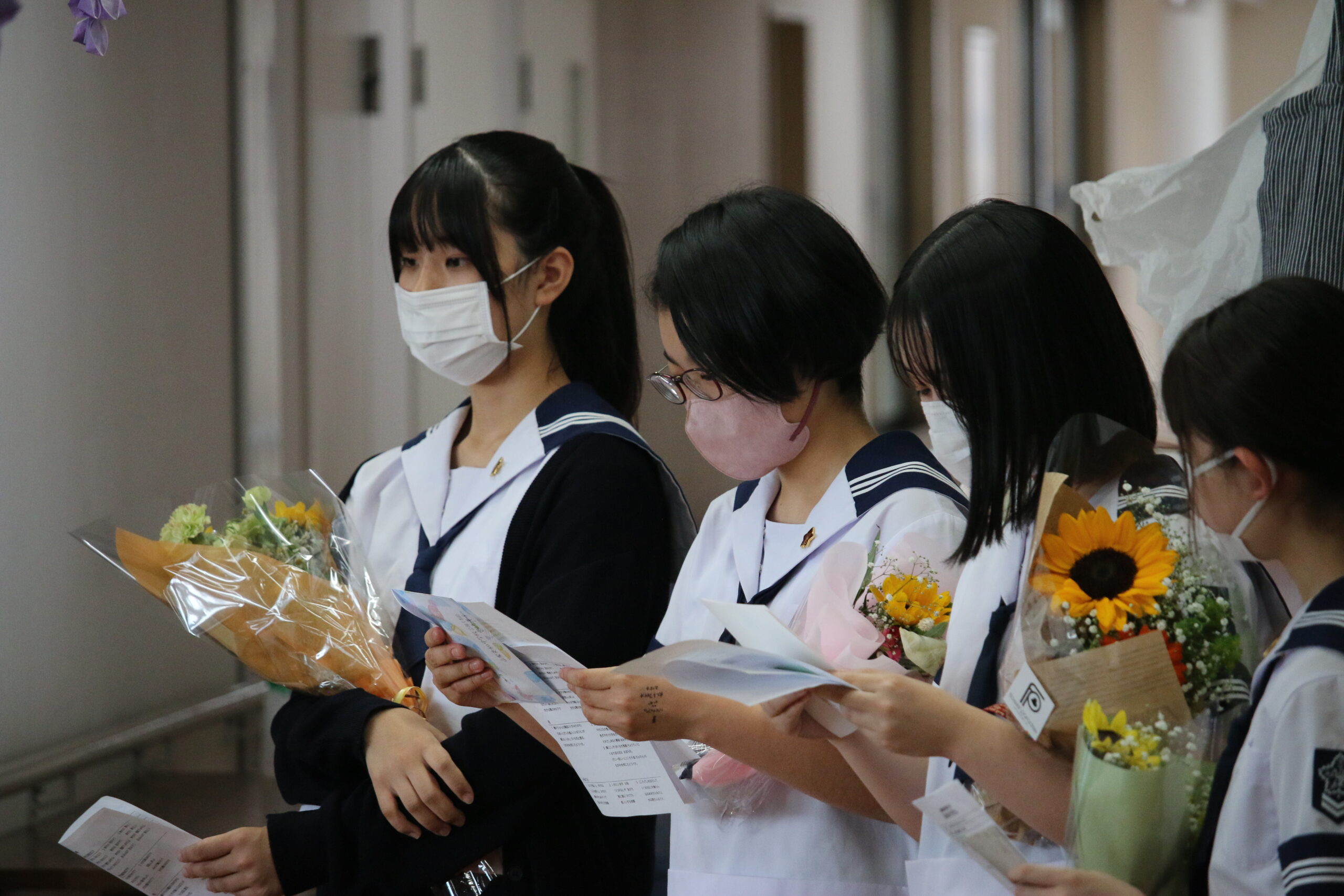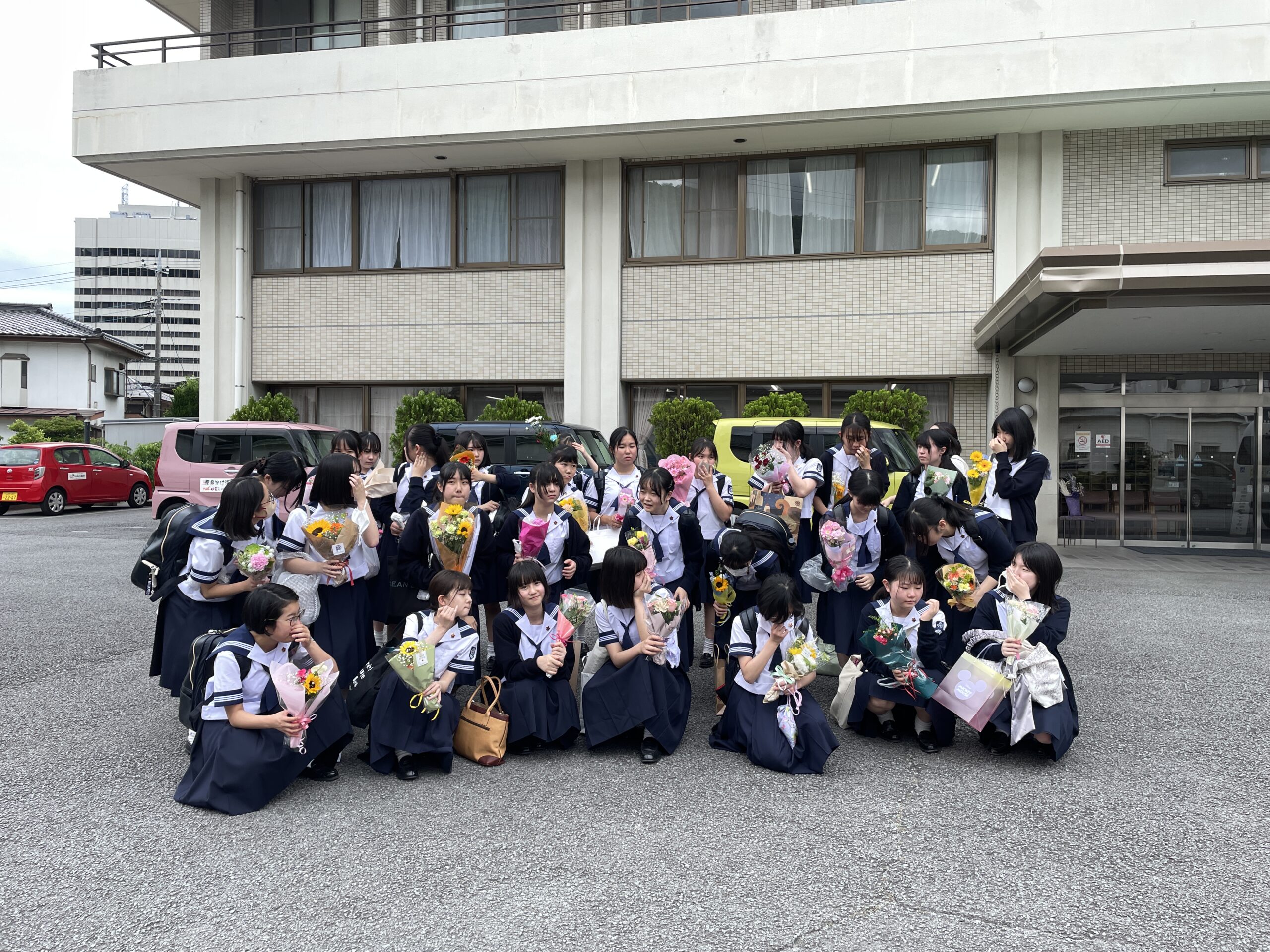 5月27日(月)山梨英和中学校・高等学校は135回目の創立記念日を迎えました。全校での記念礼拝では、講師に本校卒業生であり、教師としても教鞭をとられていた榎本富美子先生をお迎えし、神様に愛され、まもられている私たちがそれをあたりまえのこととせず、困難な生活を強いられている方々のために何ができるのか考え、祈る生活をするように、励ましをいただきました。午後からは、花束と手紙を手に県内21箇所の病院・福祉施設を訪問しました。入院されている方や入所者の皆さんと、久しぶりに交流することができました。昨年までの制限のある中では見ることのできなかった皆さんの笑顔に、元気をいただきました。温かく迎えてくださった皆さまに神さまの豊かな恵みをお祈りいたします。