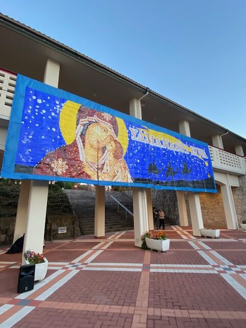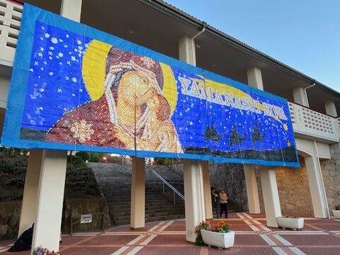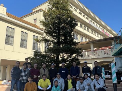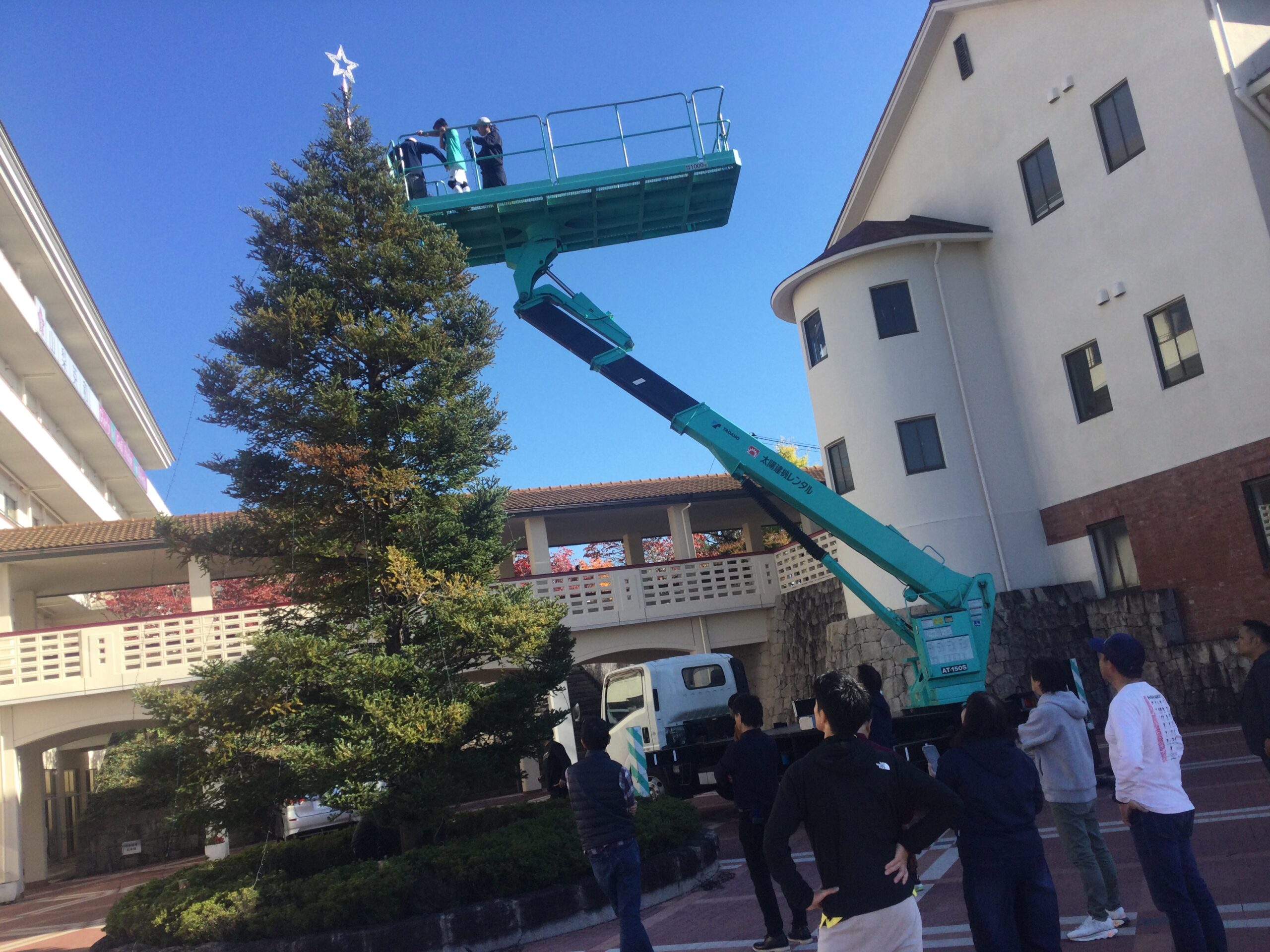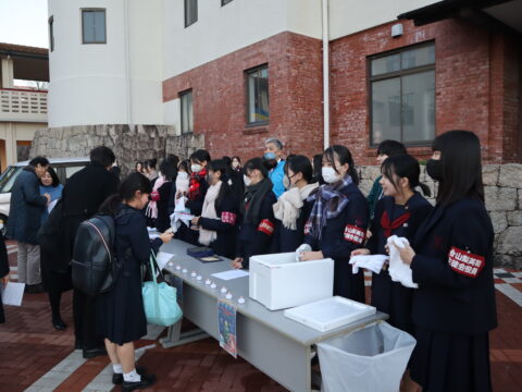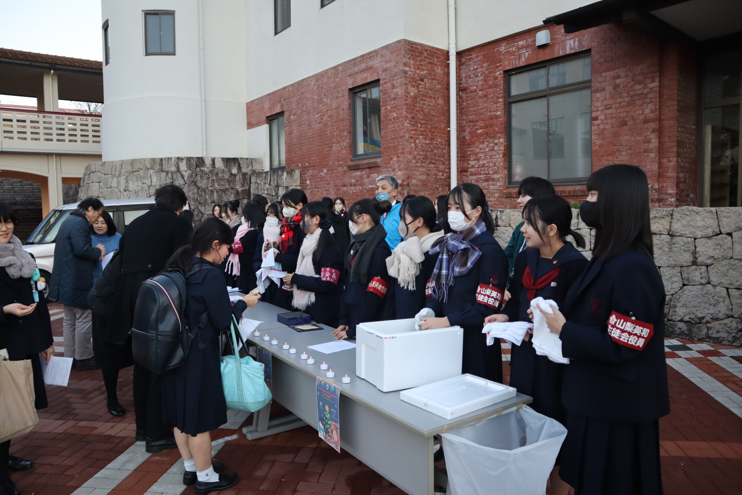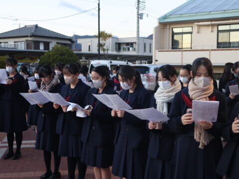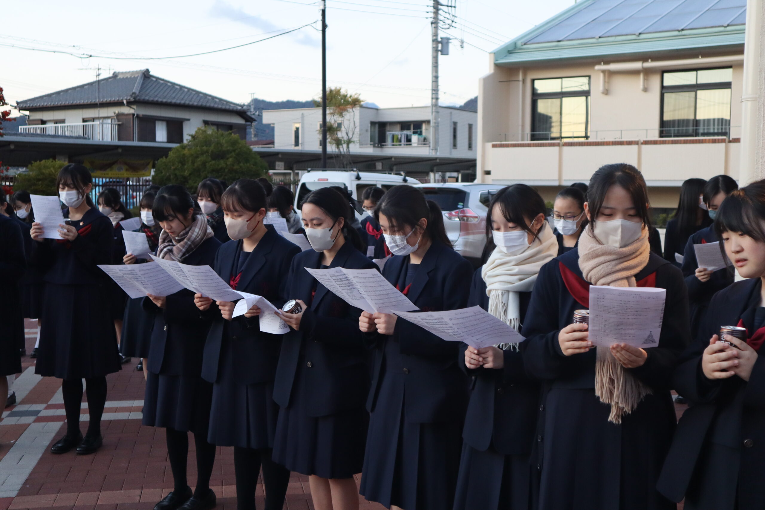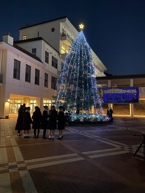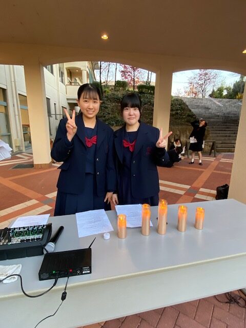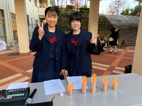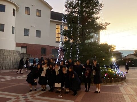山梨県内唯一のミッションスクールの本校では、1986年から毎年、アドベント(イエス・キリストの降誕を待ち望む4週間)のはじまりとして、クリスマスツリーの点火式(点灯式)を行っています。今年も11月21日に讃美歌を歌い、お祈りのあと、生徒たちのカウントダウンによりクリスマスツリーの電飾を点灯しました。今年もまた、「おやじの会」(お父様方有志の会)のみなさまに飾り付けをしていただき、更に1本250球のLED電飾ライトを23本もご寄付いただきました。お父様方には、この場を借りて感謝申し上げます。お陰さまで、点灯時には生徒たちの歓声と共に、より一層の輝きを見ることができました。生徒会の売上寄付を目的としたココアの販売は身も心も温めてくれ、チャペルの外壁に映し出された、生徒が描いたクリスマスカードの図案(過去30年分)も輝きに華を添えました。