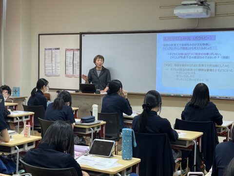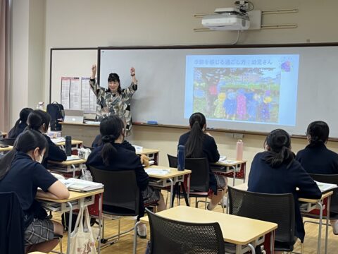 模擬授業を受けて、改めて先生の素晴らしさを実感したと同時に、やはり大変なお仕事なのだとわかりました。家庭科で学んだ幼稚園や保育園、子ども園の違いを再度確認できましたが、最近増えてきているこども園の先生になるためには、幼稚園教諭の免許と保育士資格の両方を持っている必要があると知り驚きました。また、一種と二種と専修の違いにも触れていただき、想像がしやすかったです。一番印象に残ったことは、絵本の読み聞かせです。パンどろぼうを読んでいただいたのですが、一冊の中に先生の技術が全部つまっていて思わず没頭してしまいました。物語がゆっくり流れ、最後に近づき落ち着いている場面ではページを捲るスピードを遅くしたり、緊張感があり、聞いているみんながドキドキする場面では早く捲るそうです。「本の世界を提供してあげる」ための工夫がたくさんあってとてもかっこよかったです。また、本に書いてある小さい文字にも触れていたり、登場人物によって声を変えていたりと本当に圧倒されました。入園時は何もかも先生がやっていたのに、卒園する時には一人でできるようになっている、その著しい成長を見ることができる、とおっしゃっていたことも心に残っています。今回の授業を受けて、子どもの成長を助ける先生というお仕事の大変さと大切さを知ることができ、本当に良かったです。(高2)
