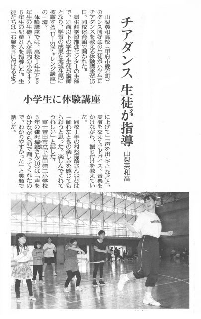この講座は山梨県生涯学習推進センター「U-21チャレンジ講座」とのコラボレーションで本校ダンス同好会の生徒が講師となり、小学生にチアダンスを学んでもらいました。