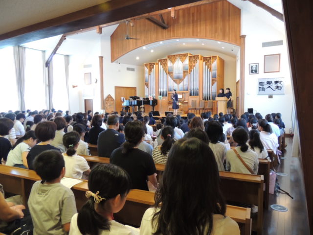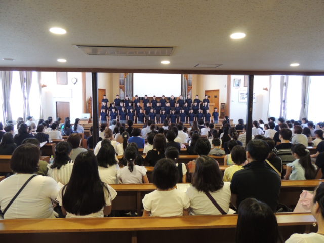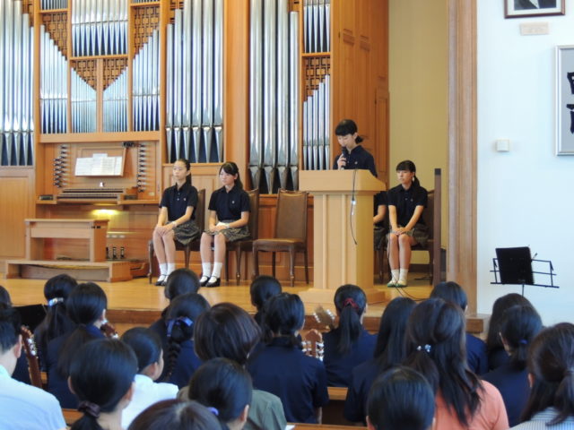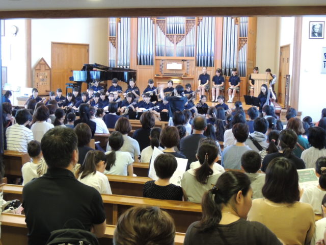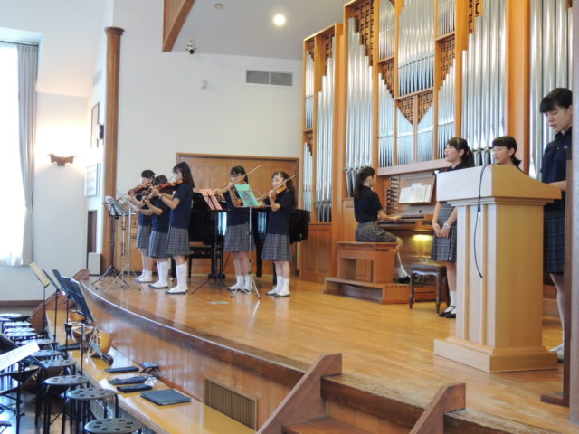 パイプオルガンの前奏、メッセージとお祈りは今年入学した中学1年生が務めました。そして後奏はマンドリン部の演奏でした。