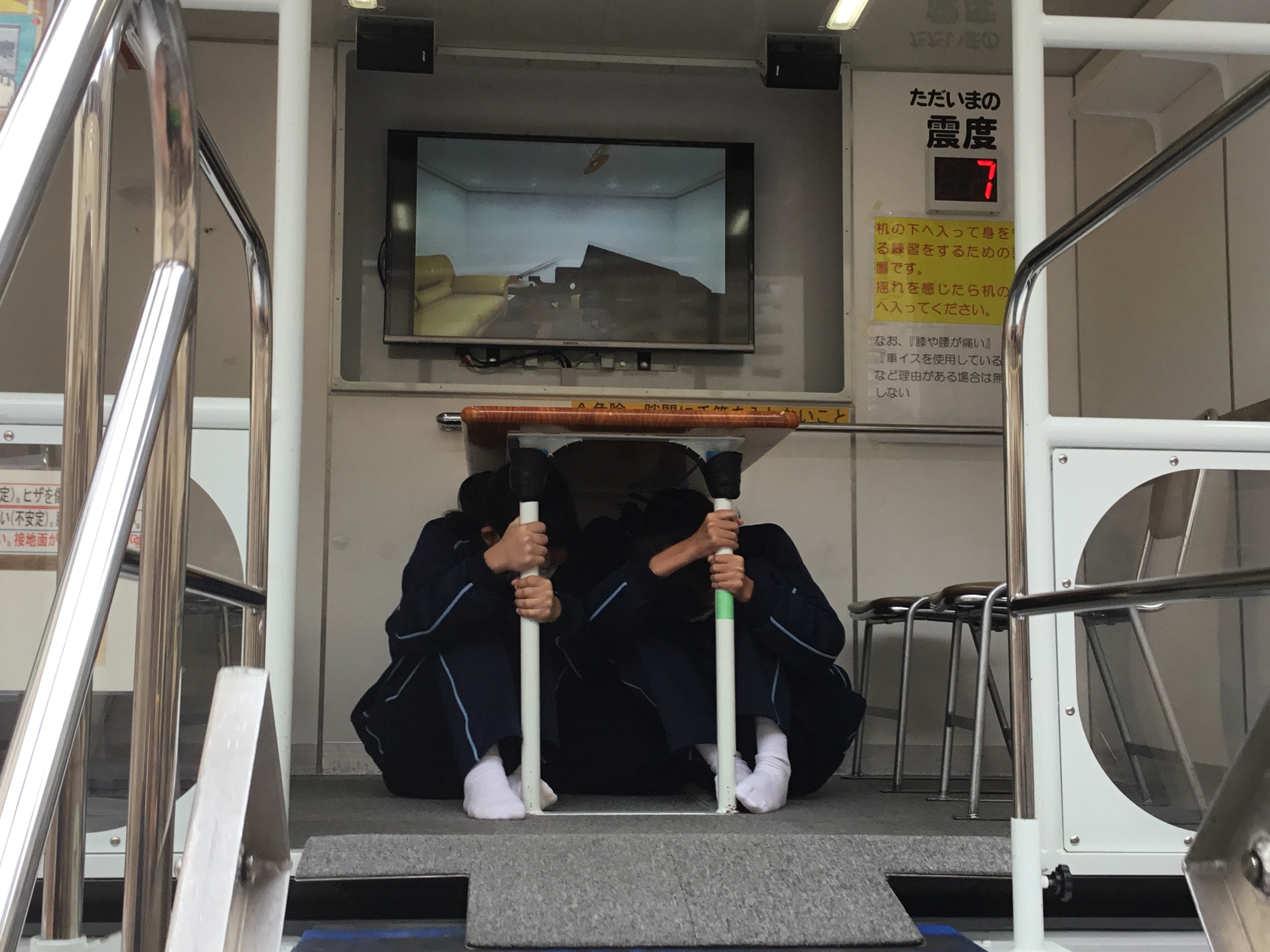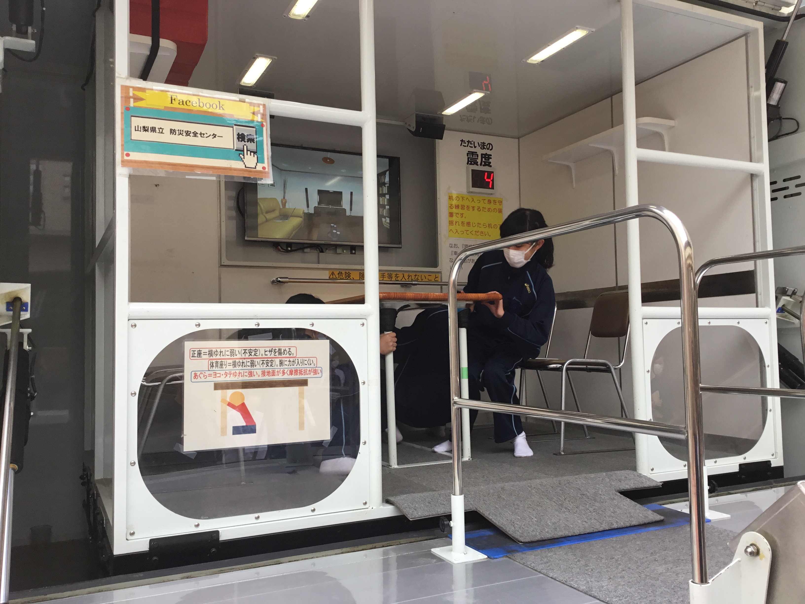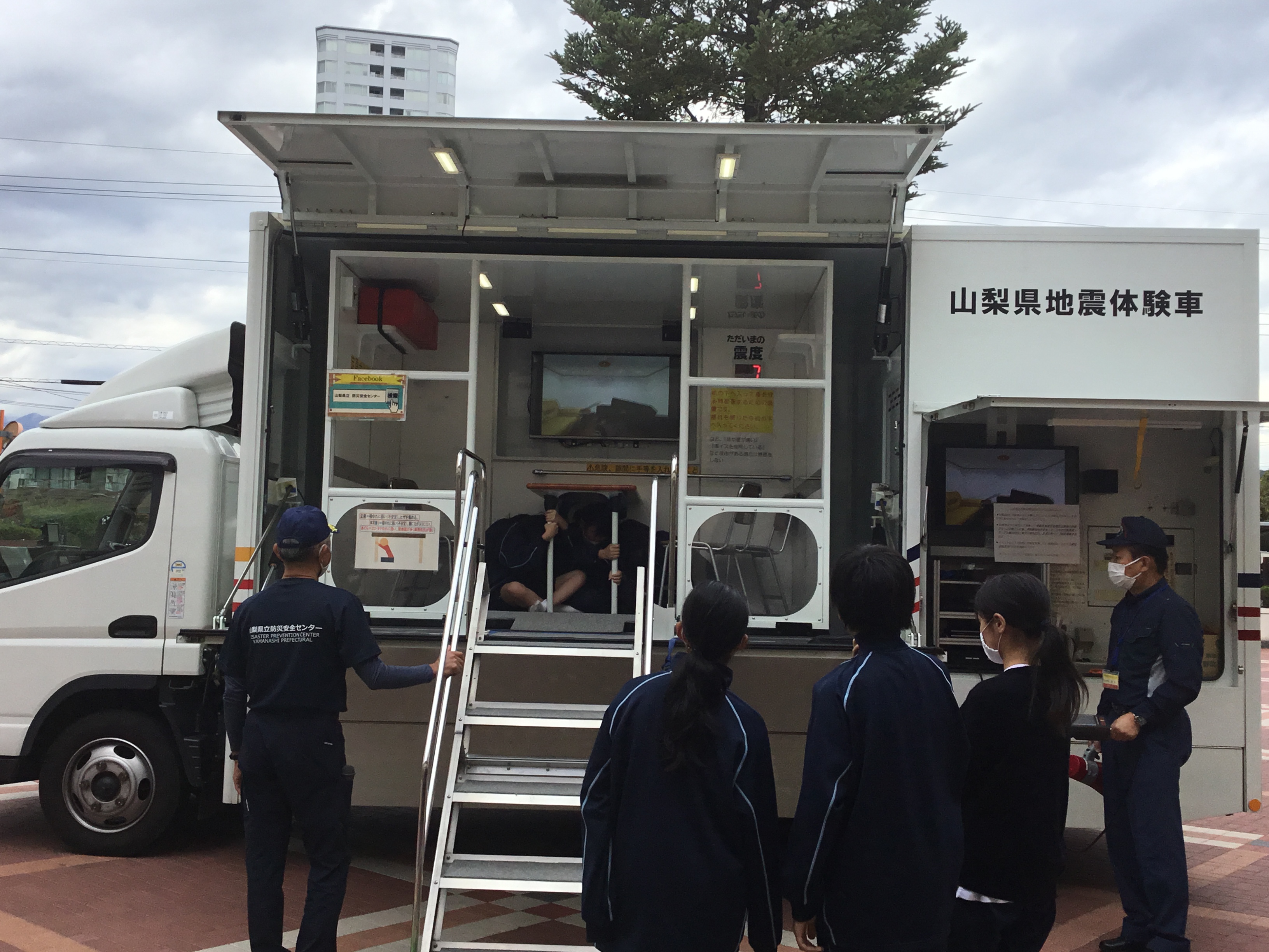 10月18日(火)に中学1年生が起震車体験をしました。県立防災安全センターの方から避難の仕方を教えていただいた後、全員が実際の揺れを体験しました。想像したより大きな揺れに驚いたり、怖さを感じたりした生徒も多く、講師の先生が言われた「大きな地震が起これば、大人であってもみなさんを助けることはできません。まずは自分の身は自分で守ることが大切です。」との言葉の意味を実感しました。今日のように来ることがわかっている地震などありません。先生の「地震は突然やってきます。いつやってくるかわからない中で想像して行動することが大事です。」ということばが一層印象に残りました。今回それぞれが学んだことを家庭でも話題にし、万が一の場合はどうするかを話し合う機会にして欲しいと思います。
