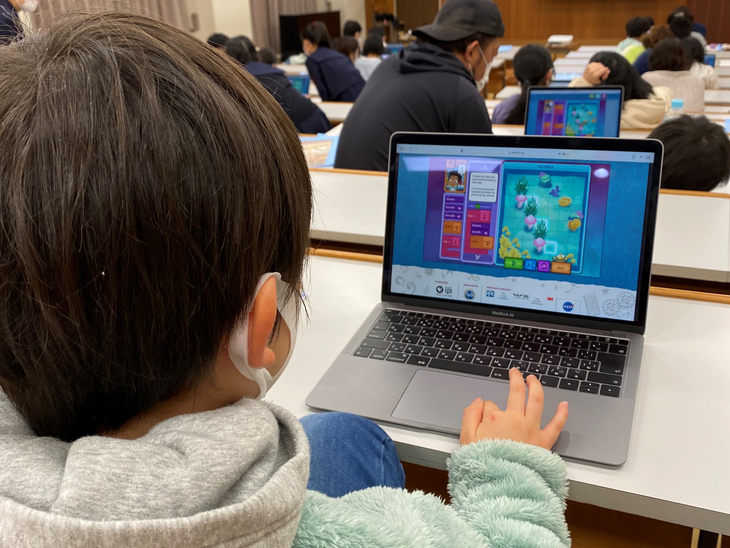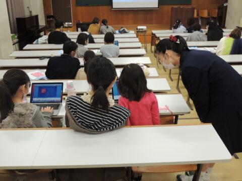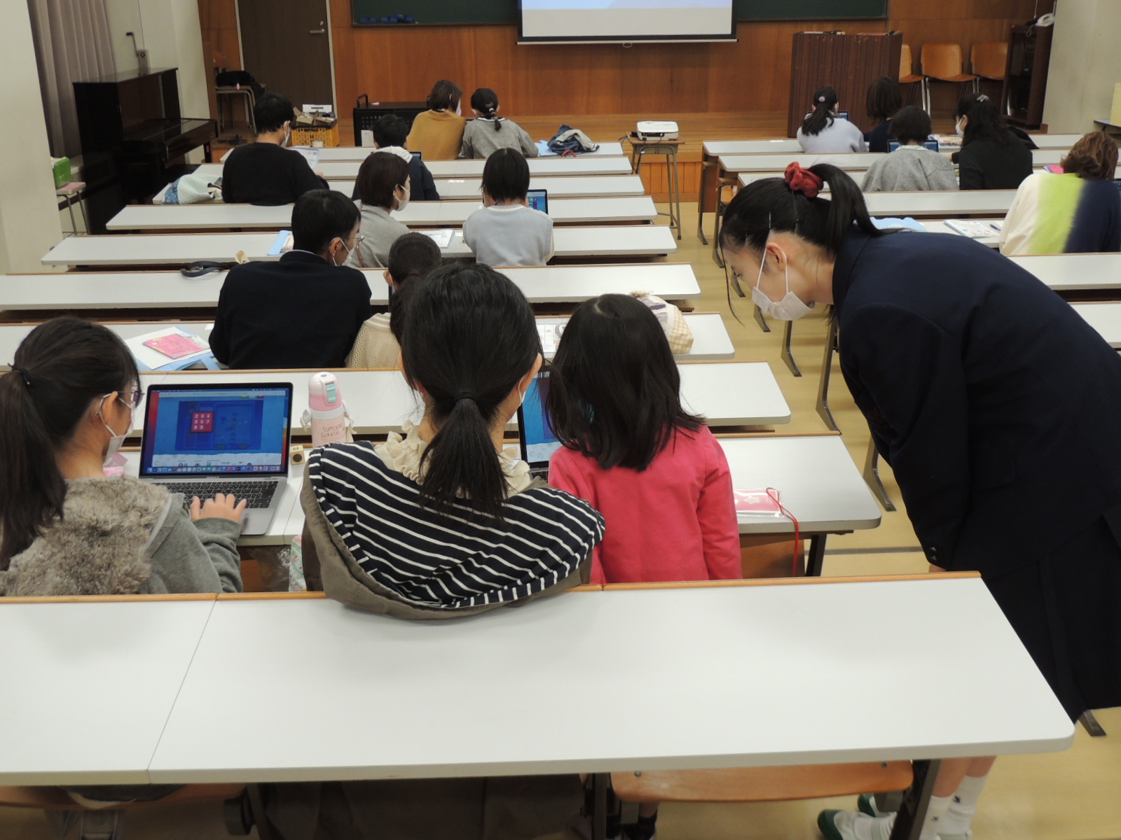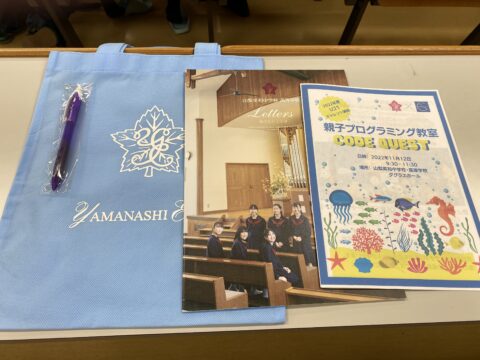 11月12日(土)に山梨県生涯学習推進センターとのタイアップ企画「U21チャレンジ講座 親子プログラミング教室」を実施しました。この講座は、21歳以下の青少年のみなさんが日頃の学習やクラブ活動、ボランティア活動などで得たものを講師となって発表するという試みで、今回、生涯学習推進センターより本校にお声がけをいただき、実施の運びとなりました。講師は本校中学2年生の2名が務め、まずは「プログラミングとは」の説明から始め、ブロックコードやゲームで使う海の生き物の名前を英語で練習し、最後はそれぞれのペースでプログラミングを学べるゲームを楽しんでいただきました。今回の目標は「たくさん間違えること!」。間違えることで、人は試行錯誤し、学びは深まります。途中、気分転換のチャペル見学も挟みながら、楽しい時間を親子で過ごしていただきました。
