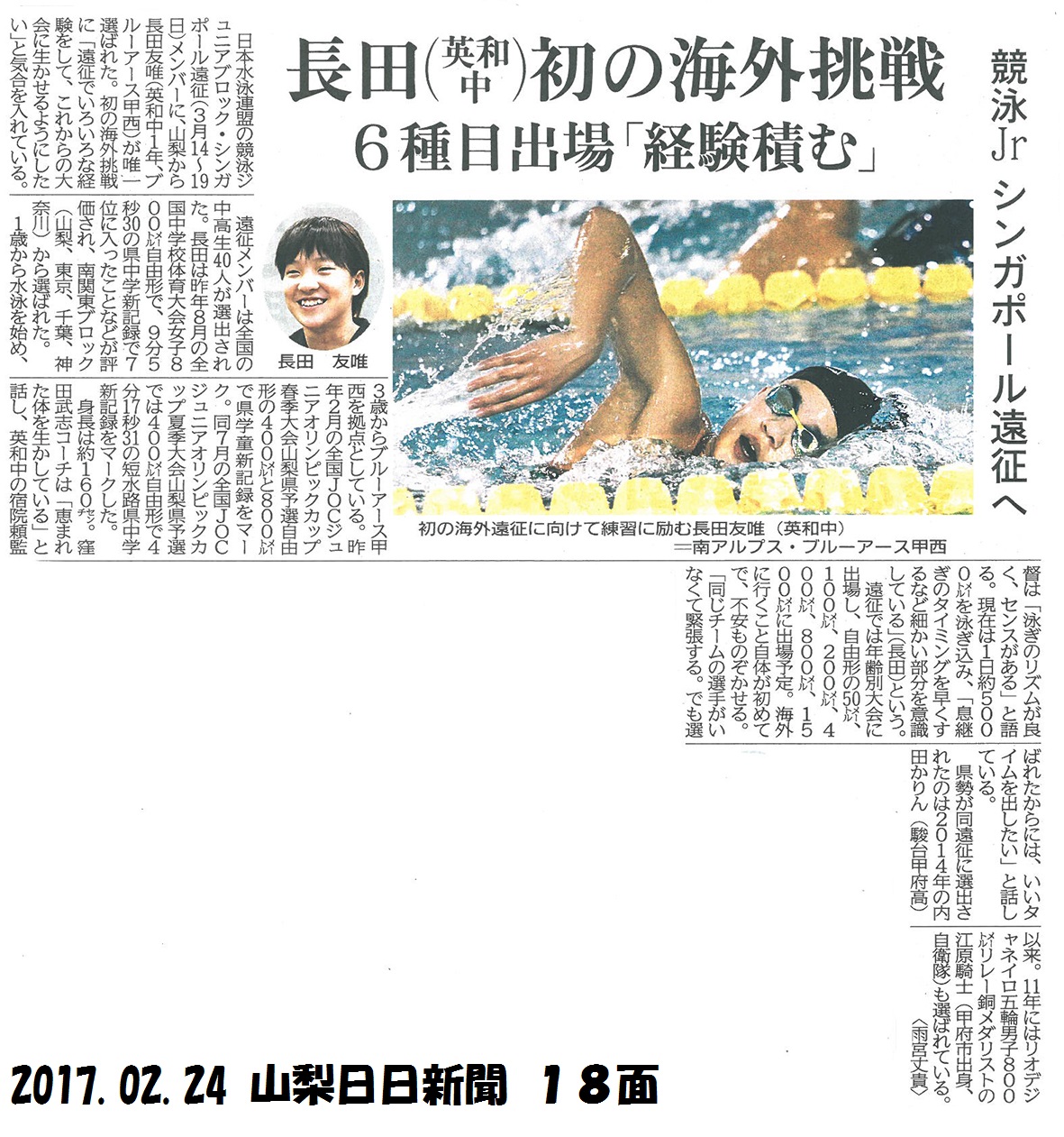 山梨日日新聞に 中学1年 長田友唯さんの記事が掲載されました