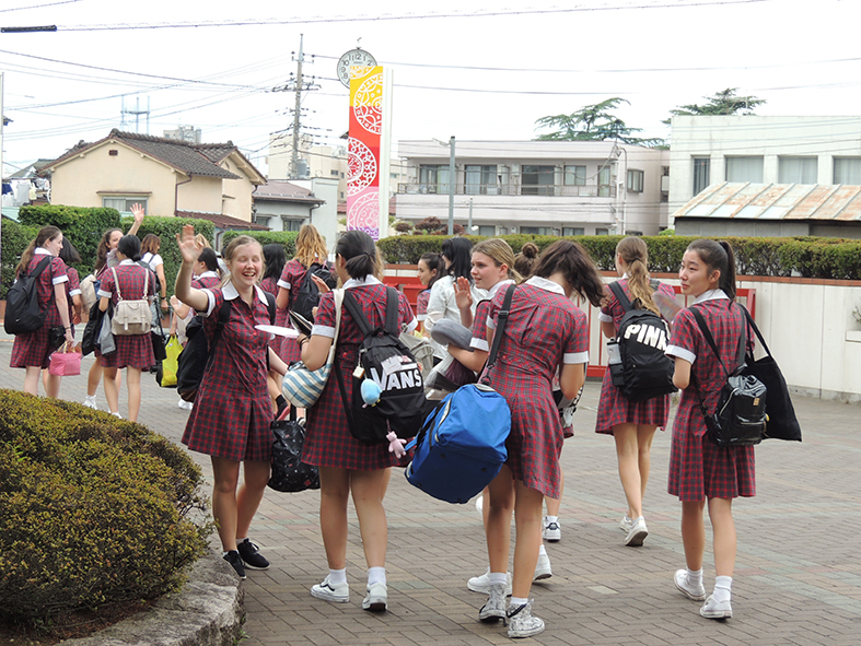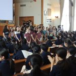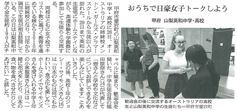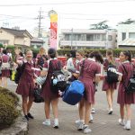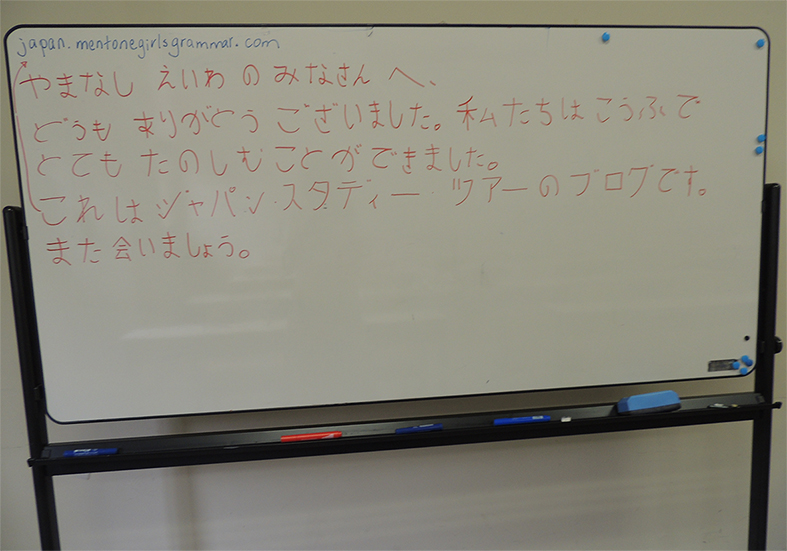 到着日は歓迎礼拝に参加し、2日目は河口湖方面へのバス遠足を行い、3日目はホストシスターのクラスの授業に、放課後は学園祭の準備に参加しました。最後の日は学園祭のオープニング・セレモニーで代表者による挨拶、校歌の披露をしていただきました。甲府城見学後、午後3時半に涙のお別れをして、英和を後にしました。