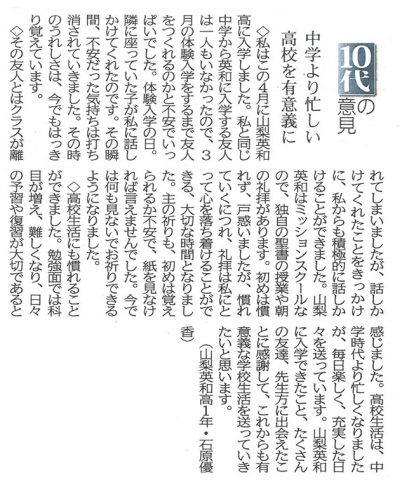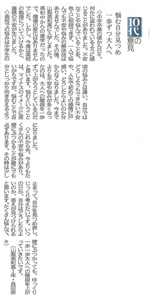 山梨日日新聞「10代の意見」に本校生徒が掲載されました。