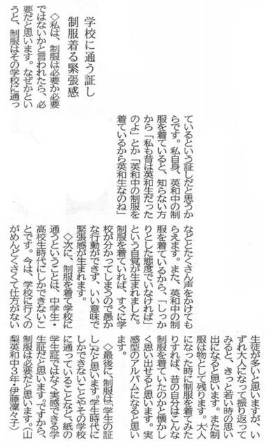 山梨日日新聞『10代の意見』に掲載されました。(9月24日,26日付)