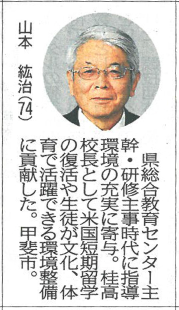 教育顧問として本校の教育活動を支えておられる山本紘治先生は、このたび、山梨県より教育功労者として表彰されました。山梨英和としても、栄えあるご受賞をたいへん喜ばしく受け止めております。先生の長年のご功績と本校の教育への大いなるご尽力に敬意を表し、ここにご報告いたします。