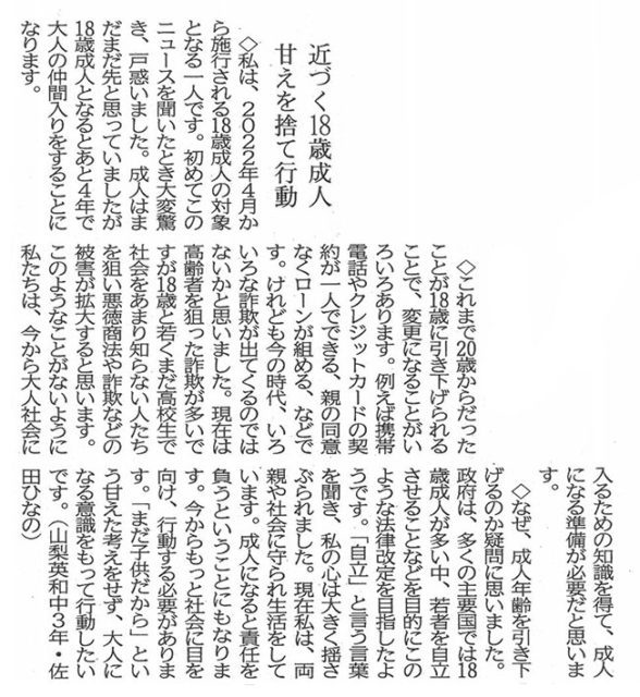 山梨日日新聞『10代の意見』に掲載されました。(12月18日,23日付)