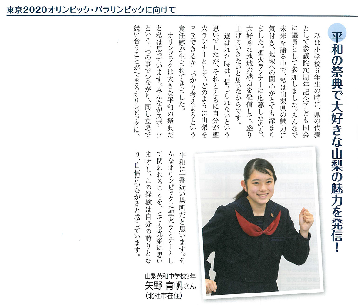 山梨県の広誌『ふれあい』特集号春に東京2020オリンピック聖火リレーに選出されている本校中学3年の生徒が紹介されました。