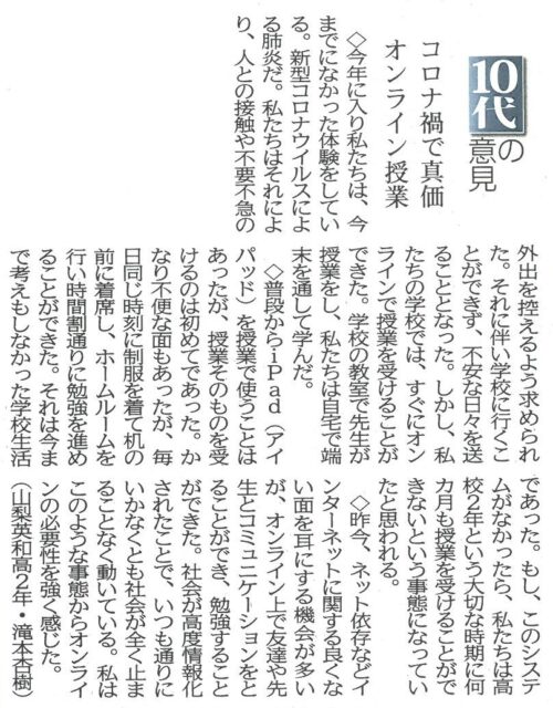 山梨日日新聞『10代の意見』に掲載されました。(9月15日付)