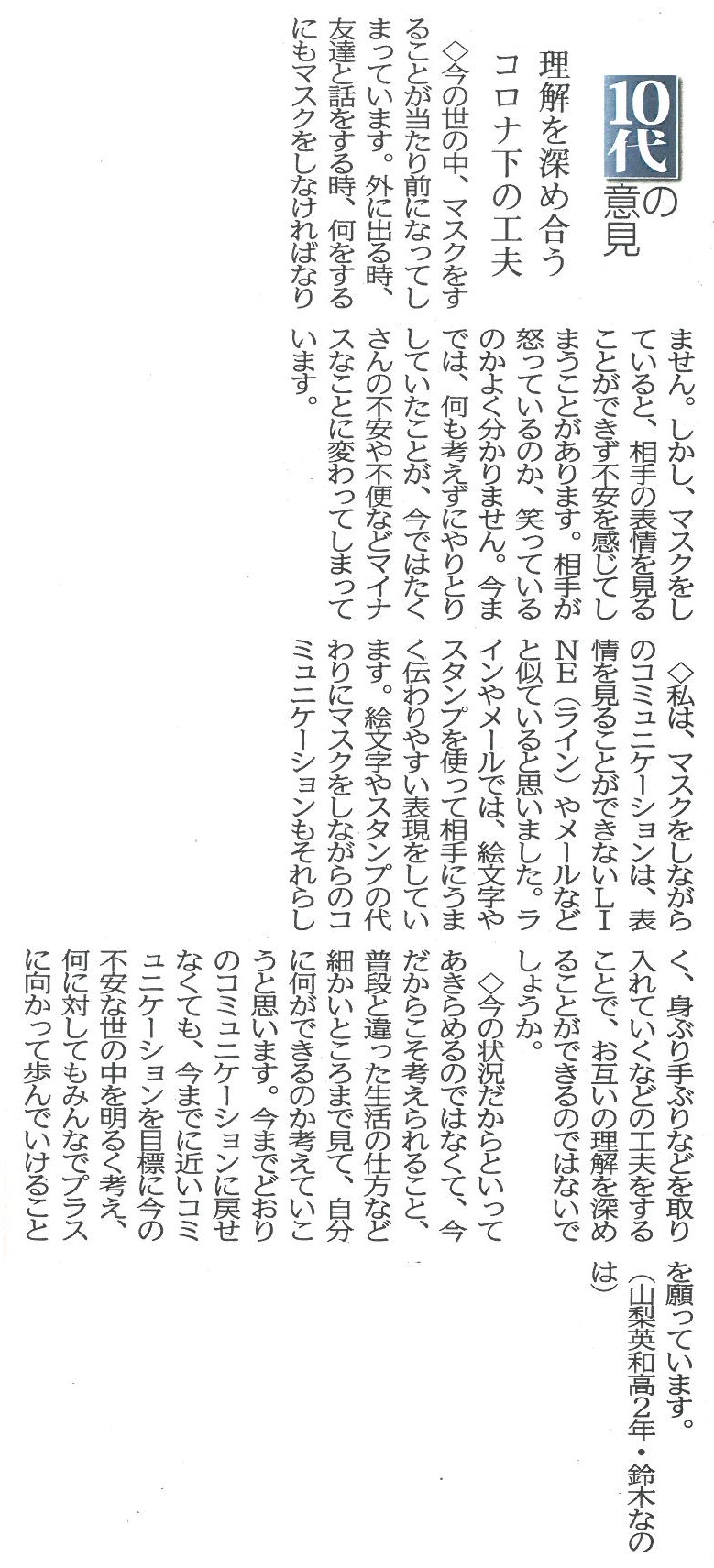 山梨日日新聞『10代の意見』に掲載されました。(10月21日付)