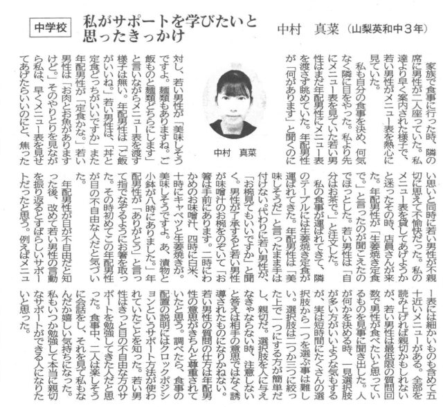 第66回「白い杖愛護運動」(山梨県・山梨県教育委員会・山梨ライトハウス主催)の一環として、目の不自由な人たちとの交流や共生をつづる「白い杖愛護作文」に小中高29校から342編の応募があり、中学の部最優秀に本校生徒の作品が選ばれ、山梨日日新聞に掲載されました。(11月1日付け)