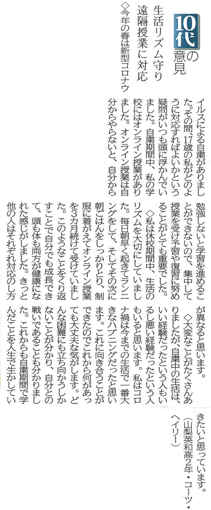 山梨日日新聞『10代の意見』に掲載されました。(12月7日付)