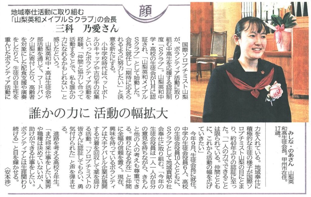 山梨日日新聞『顔』に、生徒会長で「山梨英和メイプルSクラブ」の会長に就任した高校2年生が掲載されました。取り組んでいるボランティア活動について紹介されています。(12月15日付)