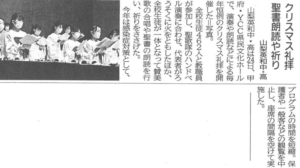 12月24日、YCC県民文化ホールにて「クリスマス礼拝」を行いました。例年保護者や同窓生、一般の方々をお招きして一緒に礼拝を守りましたが、COVID-19感染症拡大防止のため生徒と教職員のみでプログラムも短縮して実施しました。その様子が山梨日日新聞に掲載されました。(12月25日付)