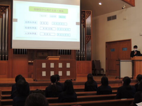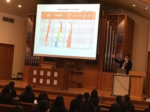 10/22、感染予防対策を取りながら高校1年生を対象に親子進路学習会を実施しました。 高校の3年間で全5回実施する親子進路学習会ですが、今回は前半に教務部長より進学したい大学の受験科目を調べて履修することなど時間割を決めるにあたってのポイントを踏まえた来年度の時間割について聞きました。 後半には進路部長より大学入試改革の概要について昨今の入試動向や入試形態の変化など説明を聞きました。 この時期に親子で考えるきっかけを作り今後の進路決定に向けて進んでいって欲しいと思います。
