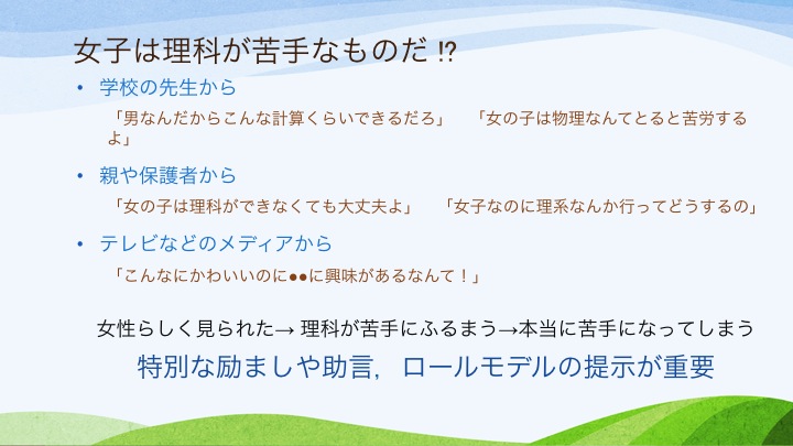 このシンポジウムはお茶の水女子大学理系女性教育開発共同機構の主催によるもので,女性の理系への進路選択の促進や,理系へ進んだ女性の社会での活躍を目指して実施されました。本校教員からは「リケジョの種を蒔きましょう」と題して,山梨英和のSSHの取り組みから得られた情報をもとに,女子が理数系に進学する上でのジェンダーバイアスの分析と女子に特化した教育の必要性についてお話ししました。