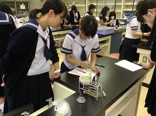 高1のSSH生物Ⅰおよび生物基礎の授業で,ブロッコリーを用いたDNA抽出実験を行いました。いつも食べているブロッコリーにもDNAがあるとはあまり意識していない生徒達も、目の前にもやもやと繊維状のものが見えてくると驚いて歓声があがっていました。オレンジジュースを使った実験でも,簡単にDNAの存在を確かめることができました。教科書で勉強した知識と,実際に実験しながら確認した手順や経験がつながり,とても充実した実験授業となりました。