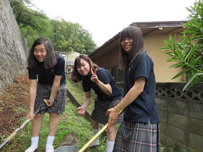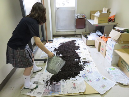 土を豊かにすると言われているミミズの効果に注目して研究しています。 この日はミミズを育てるための土を採取し,新聞紙の上に広げて乾燥させる作業を行いました。この土にさまざまな有機物を等カロリーになるよう混ぜ合わせ,ミミズの個体数の増減を調べる予定です。予備実験の段階でもたくさんのミミズを採取して飼育しましたが,1匹1匹に名前をつけて,丁寧に世話をしていました。