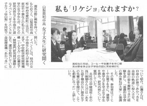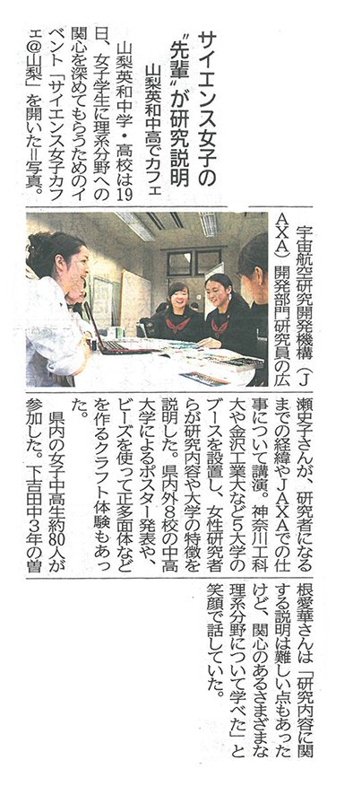 11月19日、山梨英和中学校校舎においてサイエンス女子カフェ@山梨を開催しました。校内だけでなく県内の中学生・高校生など約80名の女子が理科について語り合う機会が持てました。 JAXA研究員の広瀬史子先生による講演、理工系などの若手研究者とのラウンドテーブル、県外からも参加のあったポスターセッション、多面体をビーズで作るクラフトコーナーと凝縮された1時間半となりました。  ご参加いただいた皆さま、ありがとうございました。    ▲JAXA研究員による講演                  ▲ラウンドテーブルセッションの様子    ▲ポスター発表の様子                     ▲ ビーズクラフトの様子           11月20日付 山梨日日新聞             11月20日付 読売新聞