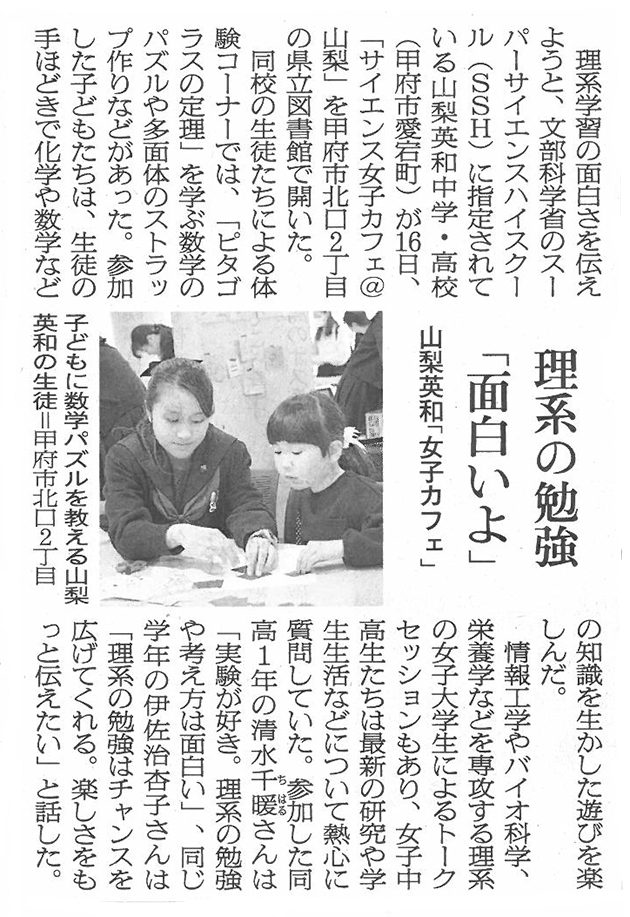 12月16日、山梨県立図書館にてサイエンス女子カフェ@山梨を開催しました。 ポスターセッションには、東京、静岡、岡山からも発表者が来てくださいました。 ラウンドテーブルでは、神奈川工科大学、千葉科学大学、金沢工業大学、城西国際大学、聖徳大学の女子学生による興味深い研究紹介を聴きました。 サイエンスアーケードでは小学生から一般の方まで、クラフトやパズルでサイエンスを楽しみました。 多くの大学・高校・企業の皆様のご協力に感謝いたします。