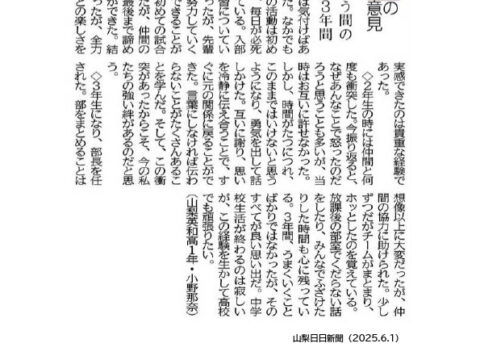 山梨日日新聞「10代の意見」に高校1年生の意見が掲載されました。/教育/学校生活/2025.6.25 -