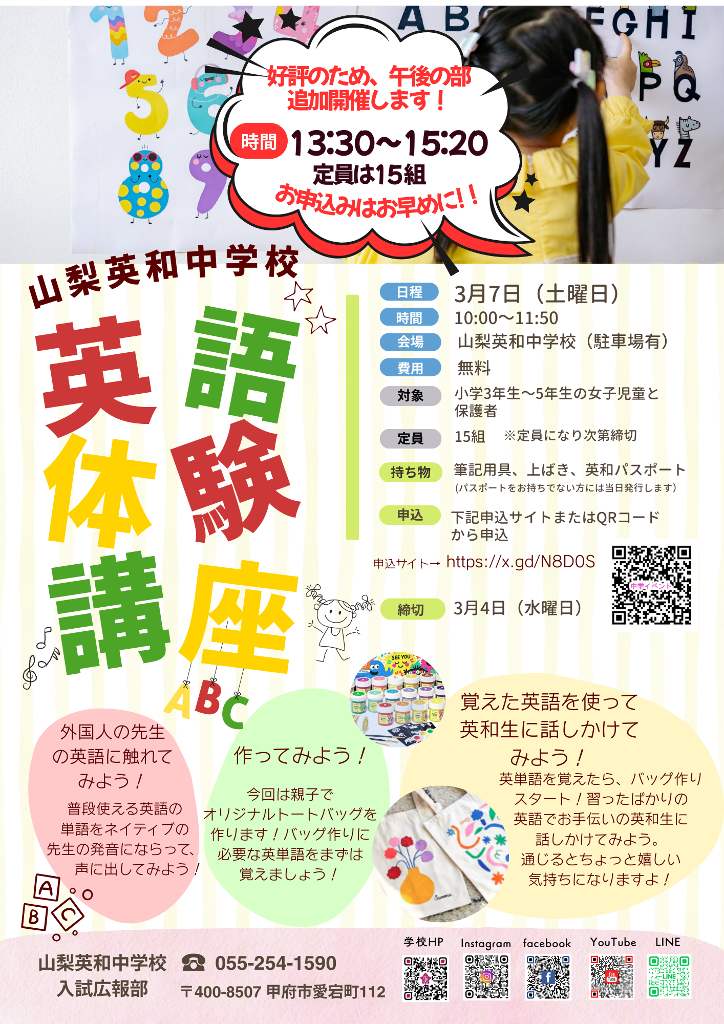【終了】🎉午後の部追加開催決定!!3/7(土)【小学生対象】英語体験講座のお知らせ