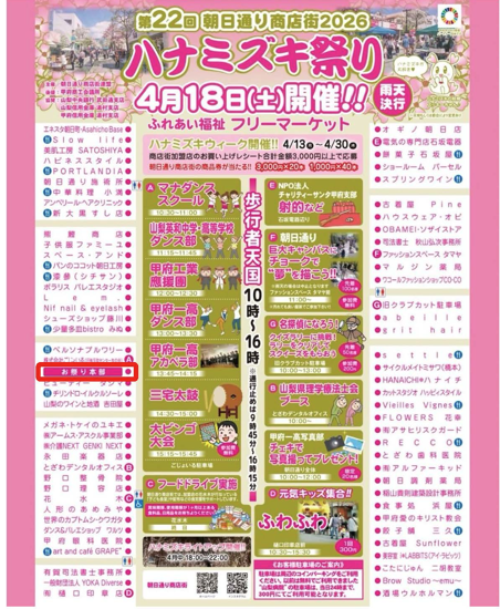 さらに会場では、ビンゴ大会や、朝日通りの路面に自由に絵を描ける「チョークで夢を描こう」企画など、子どもから大人まで楽しめる催しが盛りだくさんです。地元の魅力が詰まったマルシェも開催され、グルメや雑貨などのお買い物もお楽しみいただけます🛍️