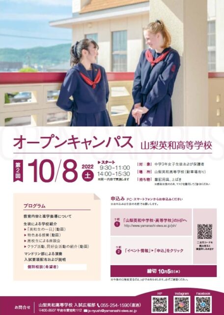 山梨英和高等学校 第2回オープンキャンパスのお知らせ
