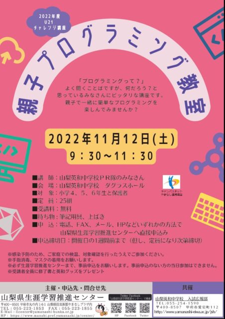小学生対象 親子プログラミング教室(U-21チャレンジ講座)のお知らせ