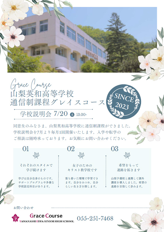 同窓生のみなさま、山梨英和高等学校に通信制課程ができました。 学校説明会を7月より毎月1回開催いたします。入学や転学のご相談は随時承っております。 お気軽にお問い合わせください。 詳しくはこちらのチラシをご覧ください。 申込みはこちらから