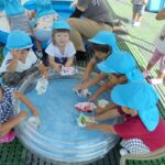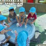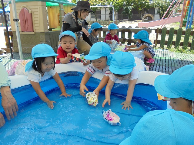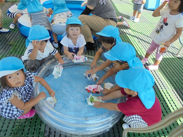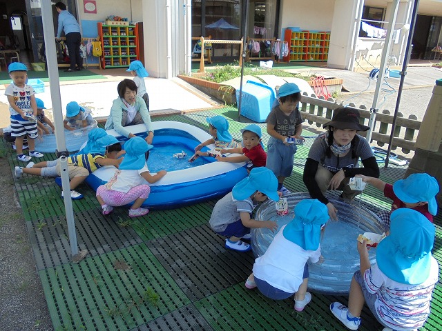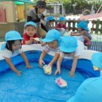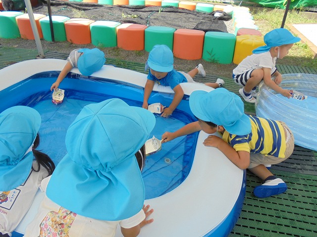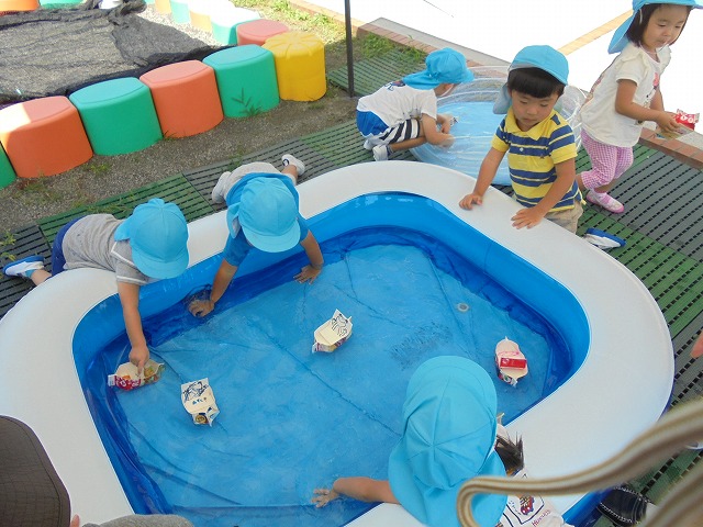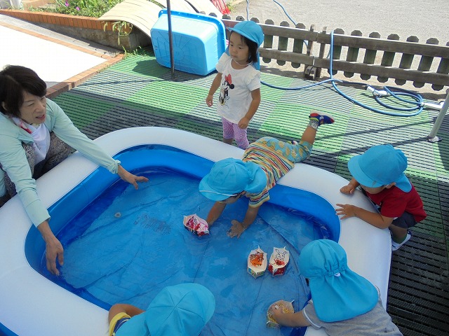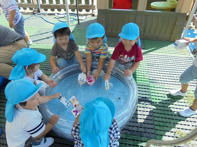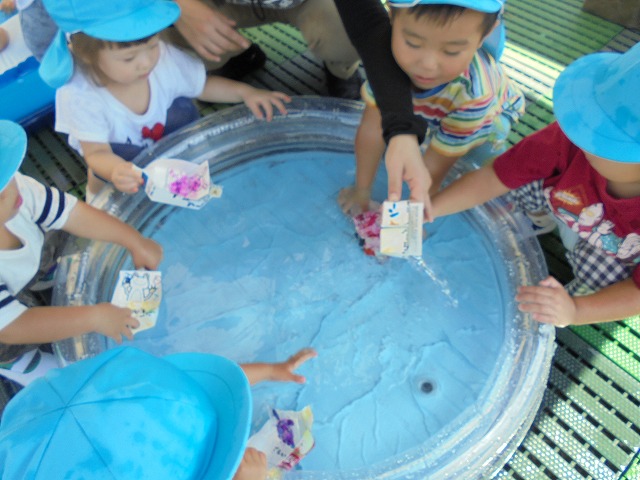 2018/09/19 メイプル 2歳児さんが水遊び プール遊びが終わった場所で、水遊びが続いています。今日は牛乳パックの船を浮かべて楽しみました。(9月1週) 前の記事を見る 記事一覧に戻る 次の記事を見る