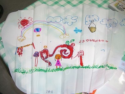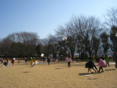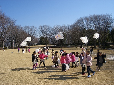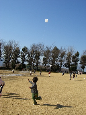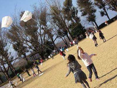 自分で絵を描いた凧を持って、中道曽根丘陵公園でたこあげを楽しみました。