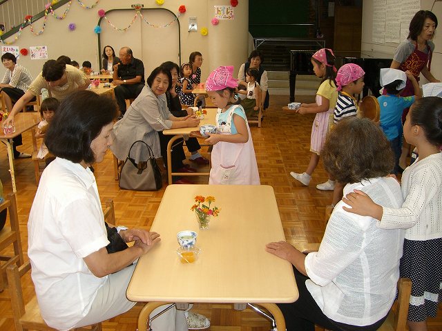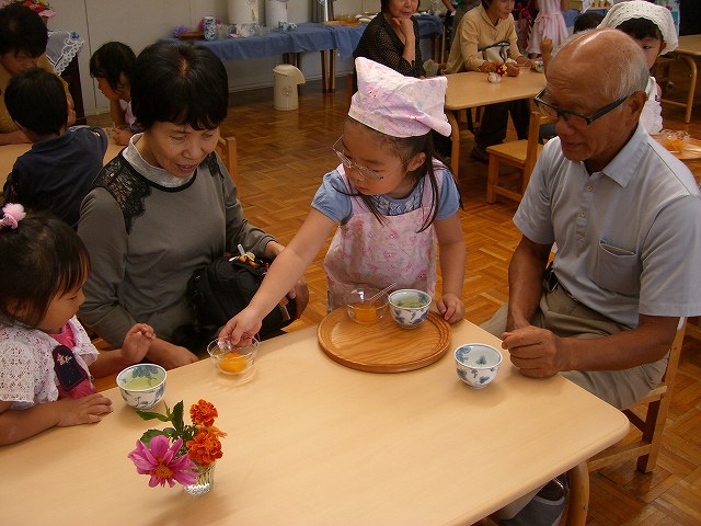 ホールがレストランになって、係の子どもたちが交代でお菓子とお茶を届けました。