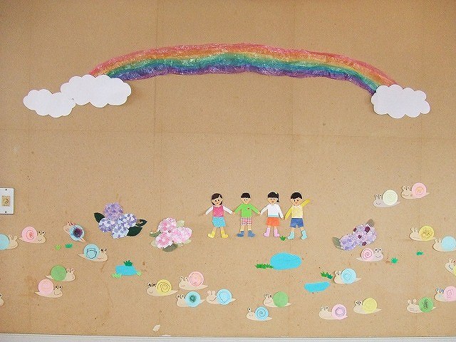 「保育室のボードつくり」 室内のいろいろな壁面を、季節感のあるものやその時に好きな物語の一場面などで飾っています。教師が作る時、子どもたちと一緒に作る時、子どもたちの作品だけで飾る時などがあります。6月は子どもたちの製作も含めて、カエルやカタツムリ、アジサイなどが目を引きました。