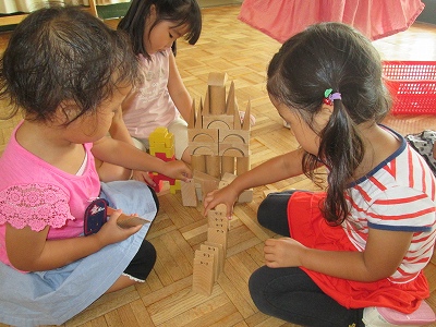 今日は積み木でお城などを作って、出来栄えに満足していました。