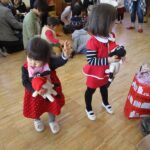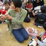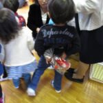 保育部でもクリスマス礼拝をし、その後先生たちによるページェント、プレゼント交換をしました。渡すまで後ろに隠している子どもたちでした。