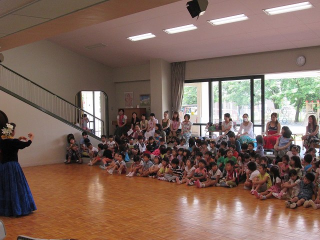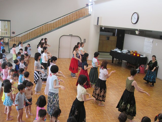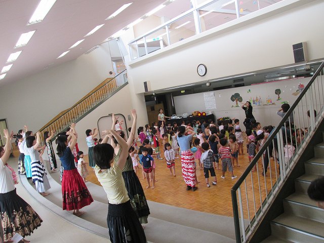 2014/06/24 メイプル フラダンス体験 共生・共育の会(保護者会)主催の講習会が年に何回かありますが、今日はフラダンスです。 素敵な音楽が園内に流れ、プールに入る前の園児たちも加わって楽しみました。 手の動きなどの意味も教えていただきました。 前の記事を見る 記事一覧に戻る 次の記事を見る