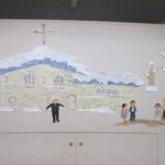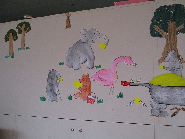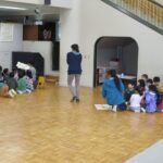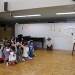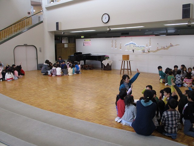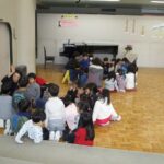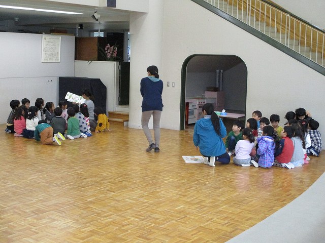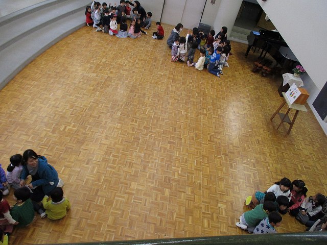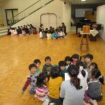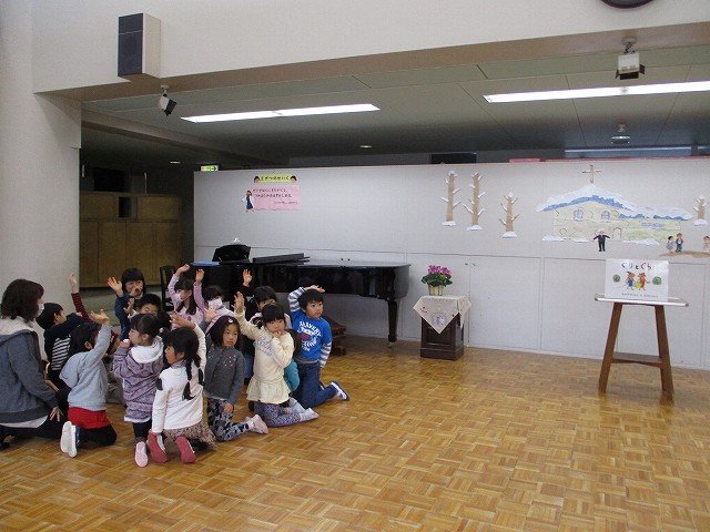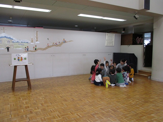 年中、年長は縦割りのグループで、保育部も年少組もみんなで考えています。たのしい会は、年度の最後にみんなで1つの物をつくり上げていく活動を進め、発表会形式でご家族の方も招待して見ていただきます。