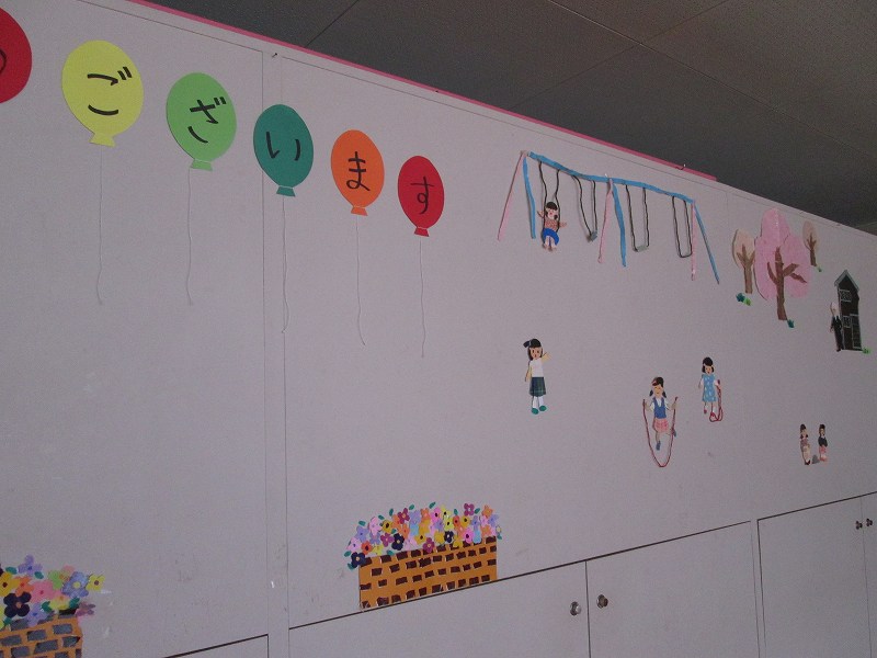 ホールのボードに、幼稚園の春の場面ができました。