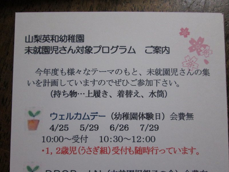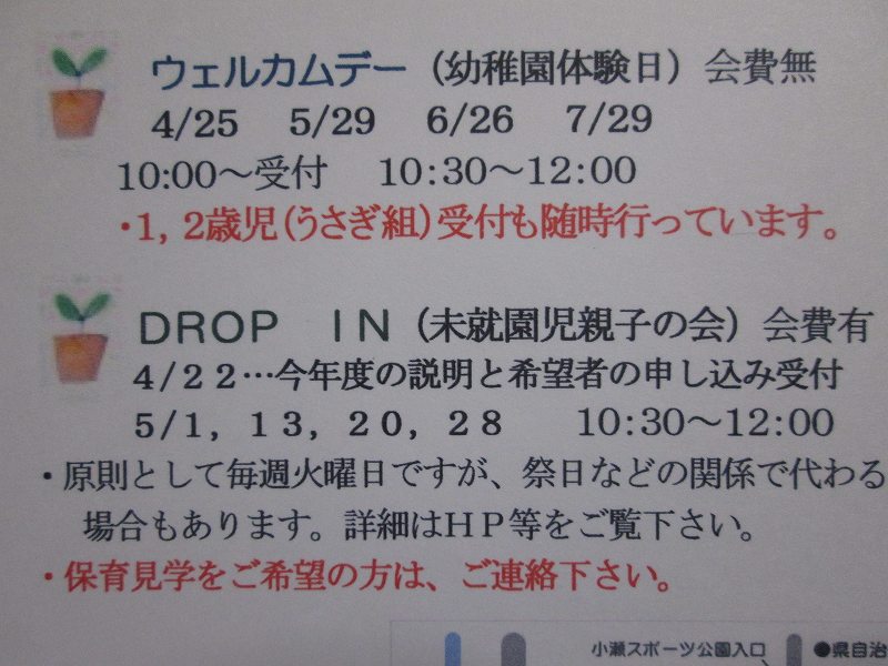 2014年度の未就園児の集い“ウェルカムデー(幼稚園体験の日)”“DROP IN(未就園児親子の集い)”の説明会、体験会をいたしますので、どうぞお出かけください。